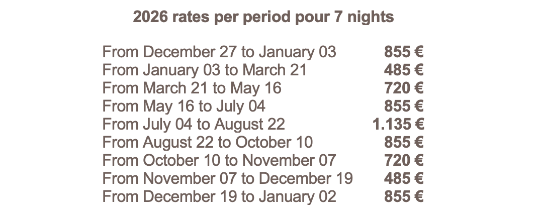 The rates include the rental of the house, bed linens, bath and pool towels, and the end-of-stay cleaning. Access to the borgo's swimming pool and tennis court is also included. Heating (which may be needed outside the summer months) and the tourist tax (€2/day/person) are charged separately.
